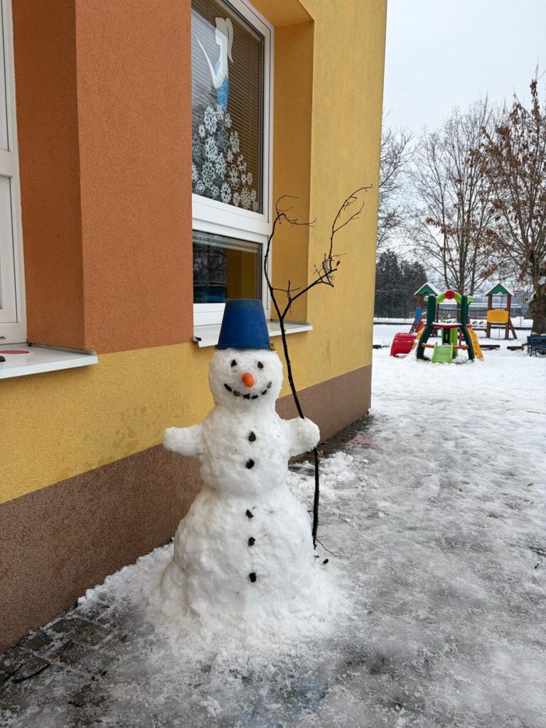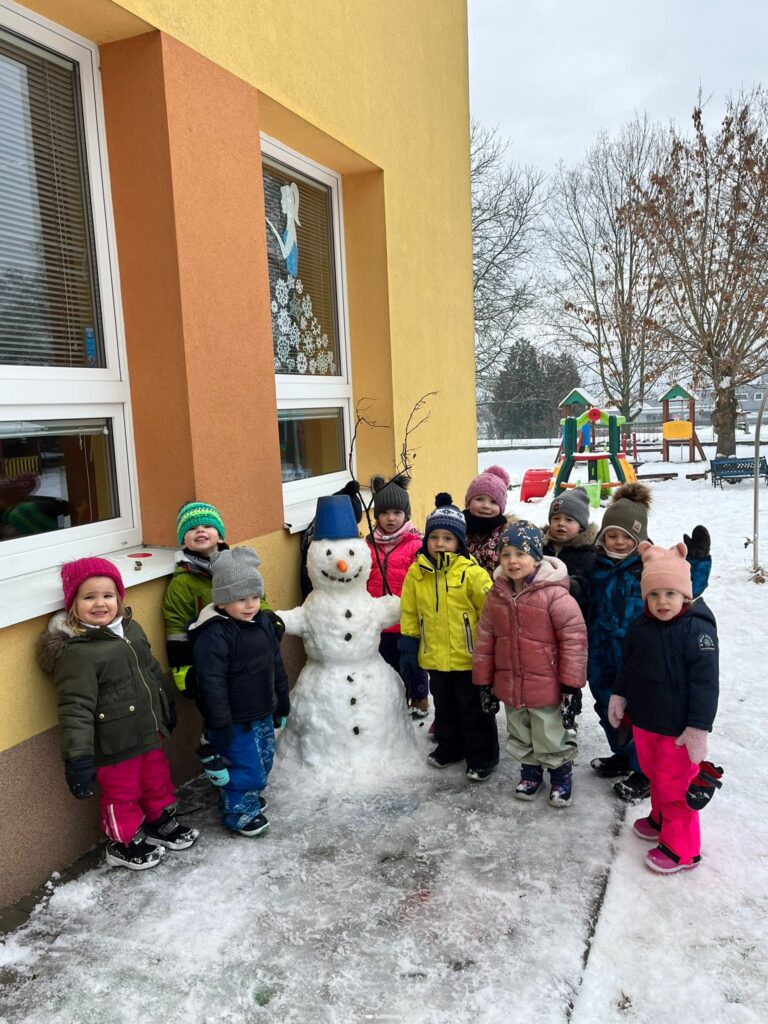 "Kuřátkův" sněhuláček panáček, má na hlavě kyblíček. Místo očí uhlíky a až dolů knoflíky. V ruce drží větvičku, místo nosu mrkvičku. Chodí, chodí bos a má bílý šos.
