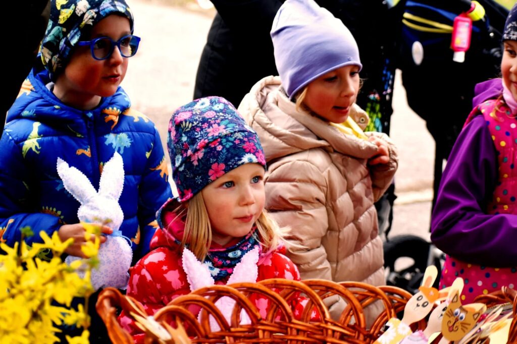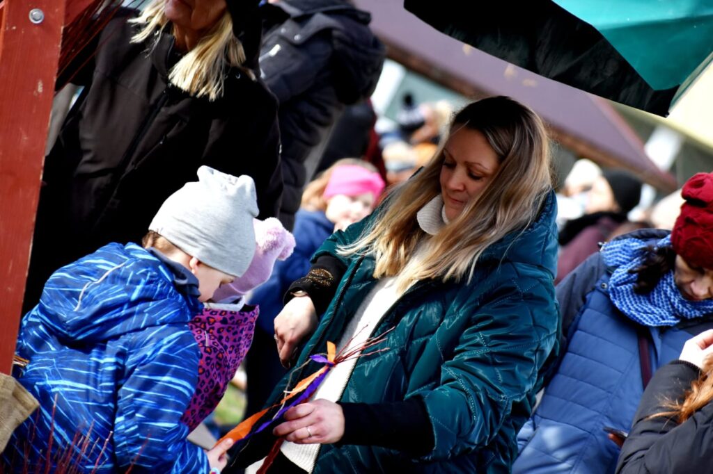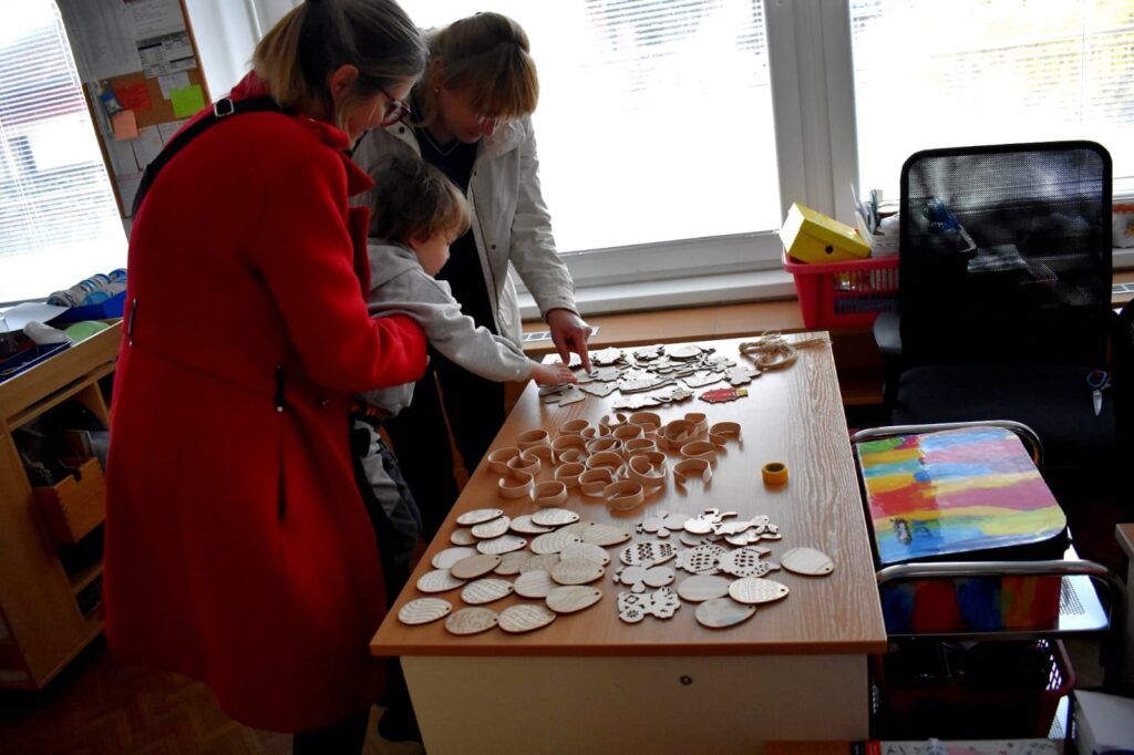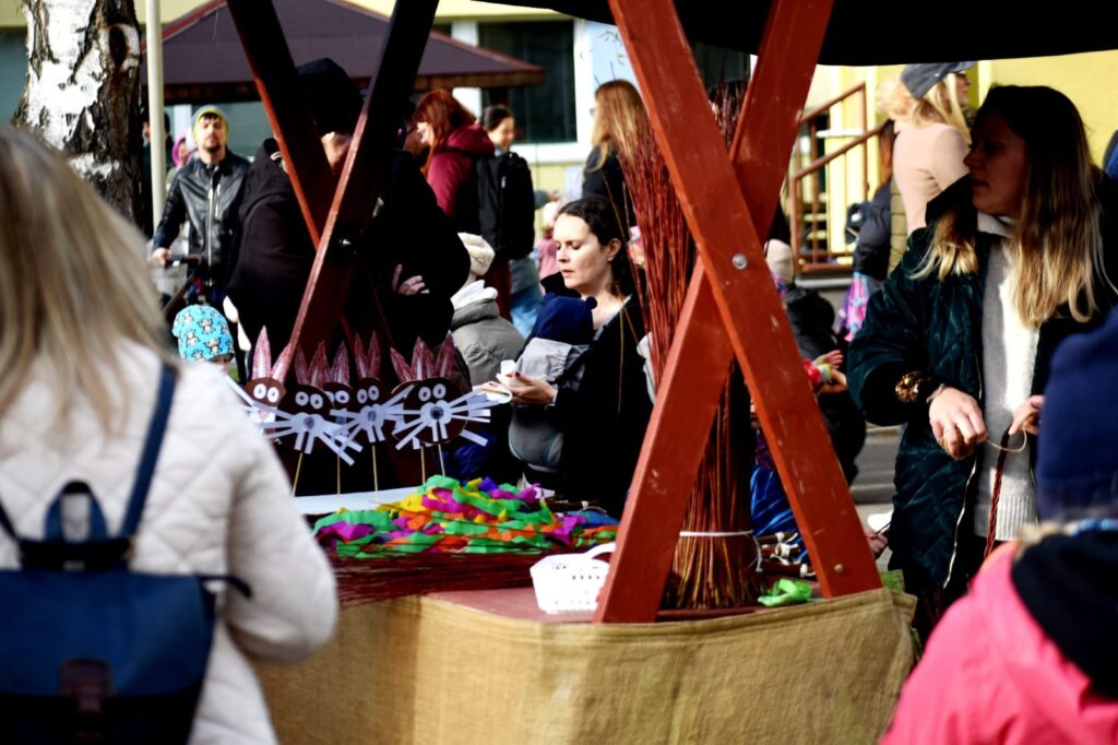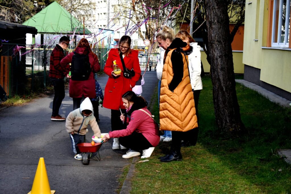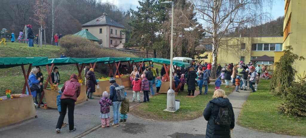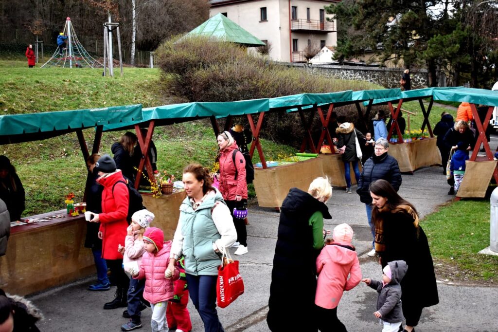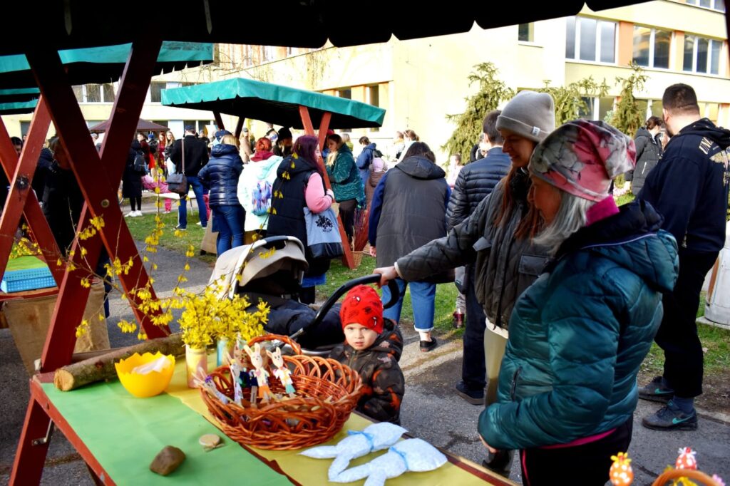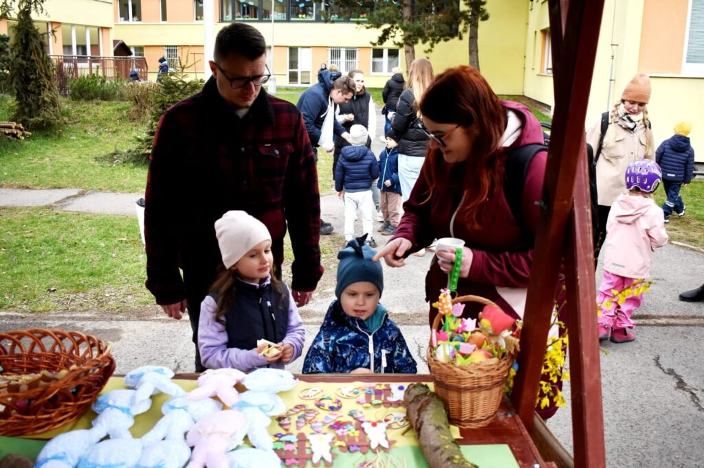 Děti s rodiči si mohli společně připomenout velikonoční tradice – vyzkoušeli si pletení pomlázky a zapojili se do tvořivých dílniček uvnitř budovy.